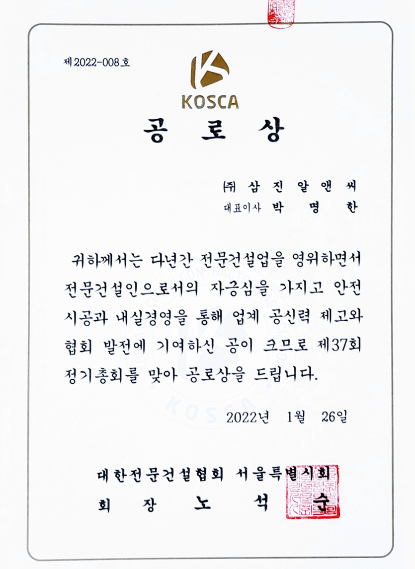 공로패 대한전문건설협회 지붕판금,건축물조립공사업협의회