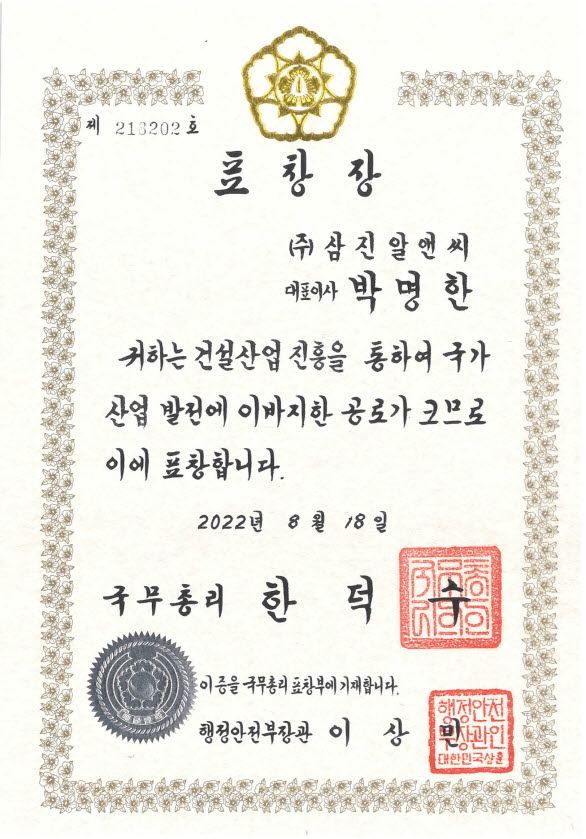 2022 건설의 날 국무총리 표창 수상 ●박명한 ㈜삼진알앤씨 대표이사