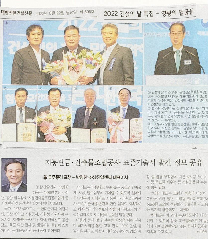 2022 건설의날 국무총리 표창 수상 관련 보도 (대한전문건설신문 발췌)
