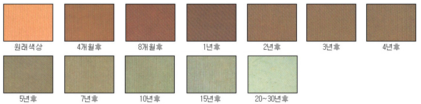색상 | 황동색(최초) → 갈색~밤색(3개월~10년) → 녹청색(10년이후) |